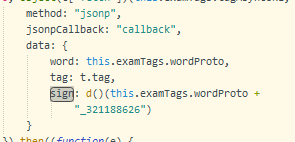 这个破解就带着很大的运气成分了,首先是我到观察sign的表达式最大为f,且刷新不会改变sign值,其他单词的sign同样如此,并且还都是32位的,第一反应是16位进制,尝试转换为二进制后,发现并无规律,也尝试使用了含有两个相同字母以上的单词进行测试,也没有发现规律。又想到了md5加密,将单词加密后仍然与sign值不相同。“干瞪眼”方法行不通,再返回到我们前面找到的js代码部分,这里我在网上找了很久,但是只找到了反向破解百度翻译sign值的方法,网上其他文中介绍破解sign时也涉及到了js某个函数,但是与这里的完全不同,百度翻译生成sign时会将单词传入函数,再生成sign,但是考频分布这里的sign中d()函数并没有传入任何的数据,在这里卡了很久很久,最终决定尝试通过后半部分来进行入手,还是先观察,this.examTags.wordProto,这个变量从名字来看的意思应该是当前这个tag(即考研还是六级还是四级等)下的单词是什么,再在后面加上“_321188626”,但是与我们前面所获得的32位字符串仍然不同,此时就靠运气,我尝试生成end_321188626的md5加密值,结果和前文的32字符串完全相同!