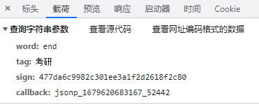 看载荷可以发现是通过网址向后端发送数据,数据分别是“word”、“tag”、“sign”和“callback”,